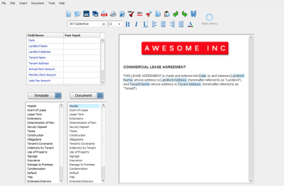 The document builder screen is divided into four areas: the toolbar, the field list, the section list and document text window.