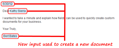 The same template can be reused to create new documents. Simply change the field input to create a new document. Below, the user has set the ' Date ' field has been set to " 6/30/12 ". The ' Customer Name ' field has been set to " Kathy Sierra ". Finally, the ' Your Name ' field has been set to "Bert Bates ".
