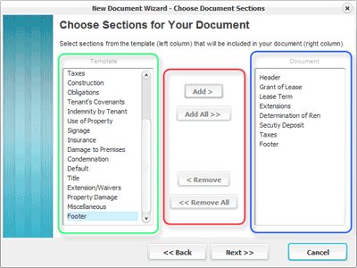 It is necessary to choose at least one section to include in a document. Highlight a section from the template (left column) and press the "Add" button to add the section to your document (right column).