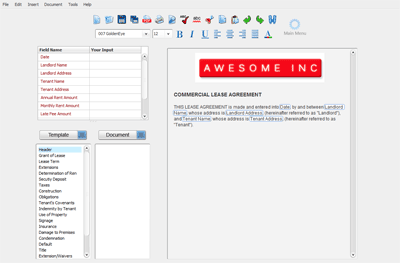 Pictured: The Document Builder. Note that no fields have been entered and no sections have been added to this document.