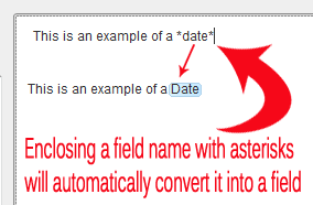For example to insert a field titled 'Date', simply type *date* in the template text. SmoothDocs will automatically convert the the text to a field.