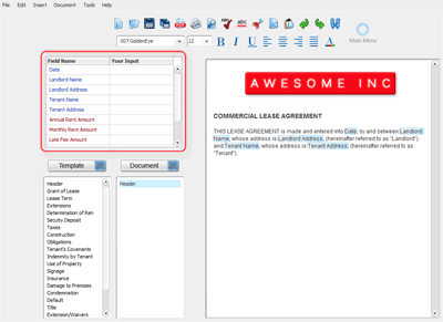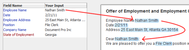 4. The text entered is updated in the active document wherever the corresponding field is used