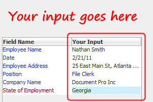 3. User input is presented on the right column. Click in a cell next to the corresponding field name and enter text.