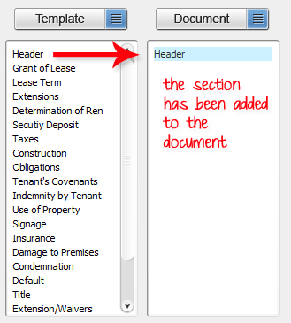 2. A list of sections contained in the template is displayed on the left column. Left-click one time on a section in the template column to highlight it.